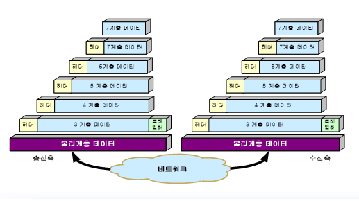 네트워크의 통신은 물리 계층을 통해서 이루어지며 상위 계층의 데이터를 전송하고자 할 때 데이터에 헤더를 추가하여 하위계층으로 보낸다.