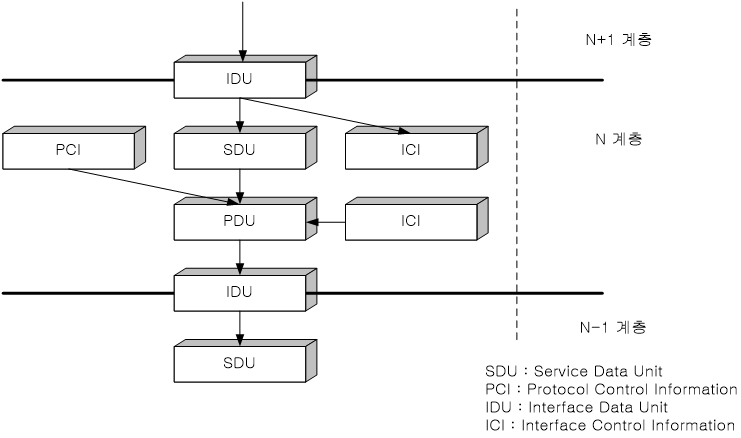 N계층의 PDU는 ICI와 결합하여 IDU로서 N-1계층에 전달되어진다.