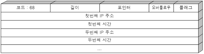 - IP 옵션의 총 길이가 40바이트로 제한되어 있으므로, 기록할 수 있는 경로의 수는 제한되어 있음.