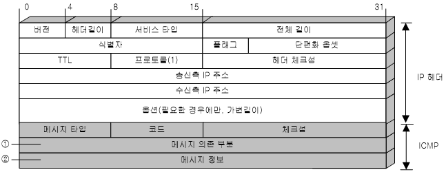 - 체크섬 - ICMP 메시지에 대해 체크섬을 계산하여 패킷의 오류를 검사