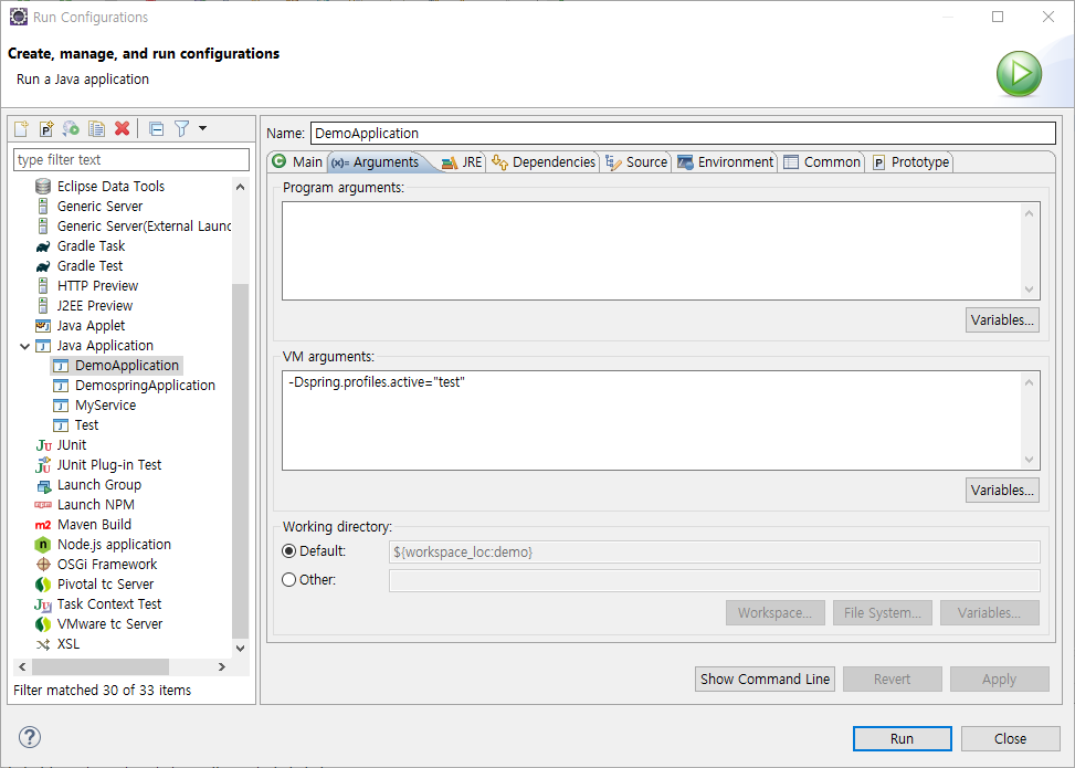 - Run > Run Configurations > 사용하는 애플리케이션 선택 > VM arguments의 Variables추가